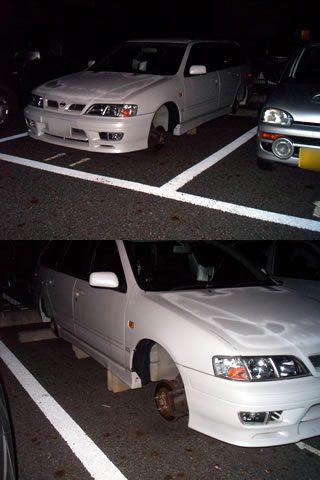 盗難から1週間と少し。悲惨な状態をさらしながら、耐えて、やっとタイヤ装着。